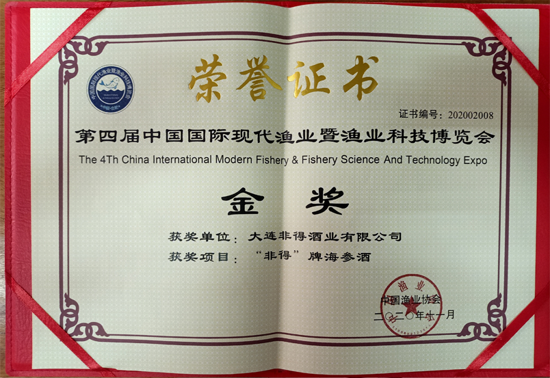 為促進(jìn)漁業(yè)品牌建設(shè),推進(jìn)漁業(yè)高質(zhì)量發(fā)展,中國(guó)漁業(yè)協(xié)會(huì)決定開(kāi)展第四屆中國(guó)國(guó)際現(xiàn)代漁業(yè)暨漁業(yè)科技博覽會(huì)評(píng)獎(jiǎng)活動(dòng)。我公司非得海參酒被評(píng)為此次博覽會(huì)金獎(jiǎng)產(chǎn)品,是全部參評(píng)產(chǎn)品中唯一榮獲此項(xiàng)殊榮的白酒品牌。