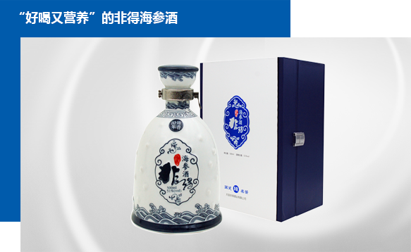 非得海參酒特選優(yōu)質(zhì)白酒與海刺參科學(xué)配伍,采用非得公司海參酶解技術(shù)(榮獲國(guó)家技術(shù)發(fā)明獎(jiǎng)大獎(jiǎng)),將海刺參精制成海參肽,并充分融于酒質(zhì)。營(yíng)養(yǎng)成分得到高效利用,酒體豐潤(rùn)飽滿,口感綿柔怡暢,具有提高人體免疫力,緩解體力疲勞、滋補(bǔ)肝腎等功效,被推崇為尊貴的接待用酒和饋贈(zèng)禮品,開(kāi)創(chuàng)了中國(guó)白酒的新品類(lèi)。